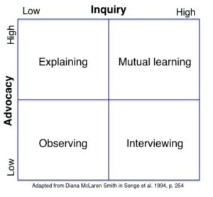 As leaders, we make better decisions, resolve conflict, and influence others by engaging in dialogue that involves mutual learning, in other words, a combination of advocacy and inquiry [2].