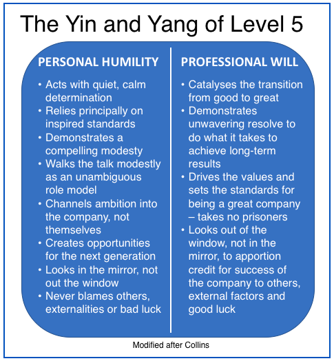 Readers may remember the good-to-great work of Jim Collins in which he introduced the concept of Level 5 Leadership. ‘Level 5’ refers the highest tier in a hierarchy of executive capabilities.